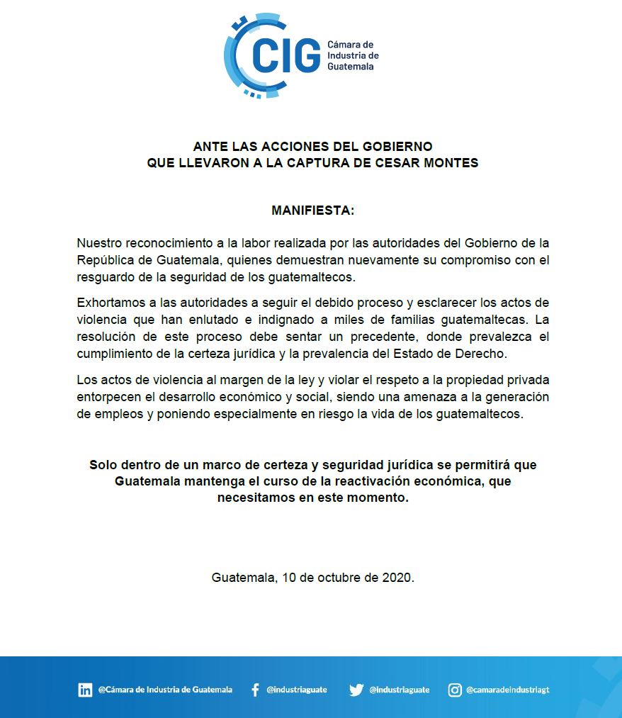 La Cámara de Industria de Guatemala también manifestó su postura. “Nuestro reconocimiento a la labor realizada por las autoridades del Gobierno de la República de Guatemala, quienes demuestran nuevamente su compromiso con el resguardo de la seguridad de los guatemaltecos”, se difundió en un comunicado.
