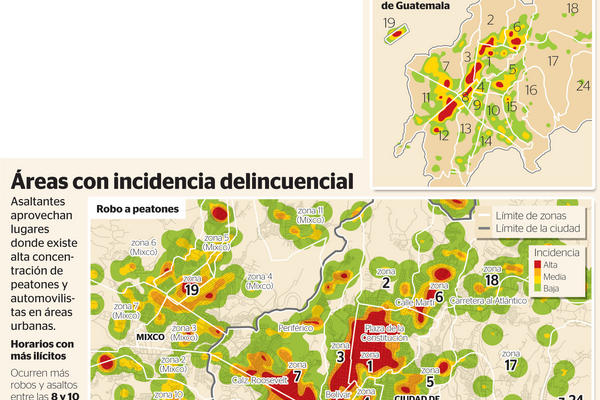 En la zona 11, las áreas más peligrosas son la colonia Mariscal y los alrededores del mercado del Roosevelt, en la 13 calle. En la zona 12 se sugiere tomar precauciones en La Reformita, en tanto que en la zona 21 el sector de mayor riesgo es la colonia Justo Rufino Barrios. En otras zonas la incidencia es menor.