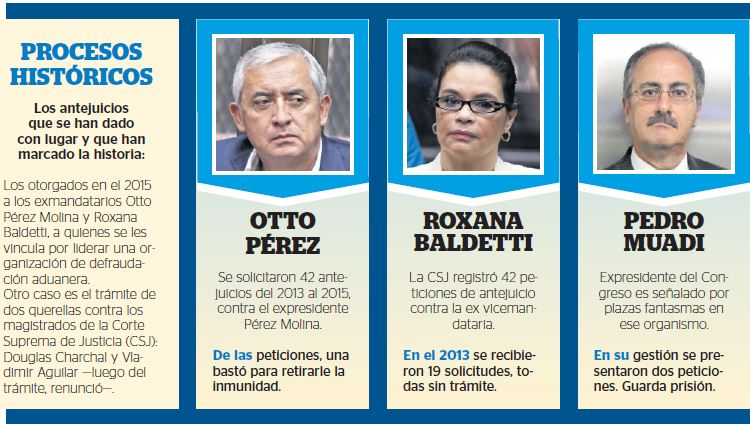 Además, el informe registra que las peticiones fueron dirigidas contra ministros, magistrados de salas, diputados y los exmandatarios Otto Pérez Molina y Roxana Baldetti.