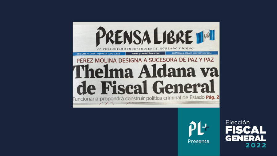 Finalmente, el 9 de mayo, el presidente Otto Pérez anunció que Thelma Aldana sería la nueva Fiscal General. Tenía en ese momento 58 años y se identificaba con la ideología de derecha y llegaba al Ministerio Público con la sombra que supone que desde antes de iniciarse el proceso de postulación se le vinculó con el Gobierno y se le llamó la “candidata oficial”.