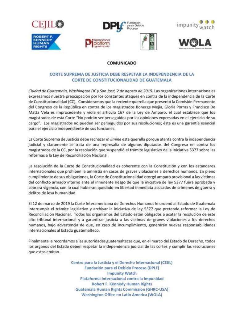 Las entidades Centro para la Justicia y el Derecho Intenacional (Cejil), la Fundación para el Debido Proceso, Impunity Watch, la Plataforma Internacional contra la Impunidad, Robert F. Kennedy Human Rights, Guatemala Human Rights Commission y Washington Office on Latin America, compartieron un comunicado en donde instan a la Corte Suprema de Justicia (CSJ) a “respetar la independencia” de la CC.