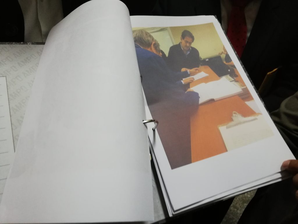 Alejos mostró fotografías donde compareció a la Feci el 25 de julio pasado, luego el 30 de julio último en donde reitera ante la Fiscalía que conoce que existe una investigación en su contra y que sea citado.