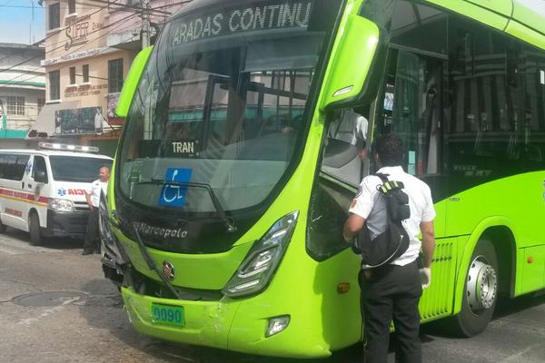 En la 19 calle y 1a avenida de la zona 1 se produjo el choque entre una unidad de Transmetro y un vehículo.