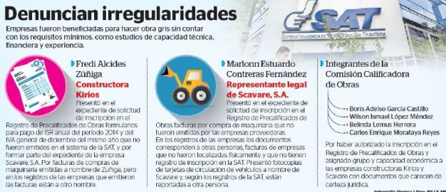 La denuncia expone que el 11 mayo del 2015 la Junta Calificadora autorizó la inscripción en el Registro de Precalificados de Obras y asignó grupo y capacidad económica a la constructora Kirios, y la empresa Scavare fue inscrita el 20 de marzo de ese año, ambas con documentos aparentemente falsos.