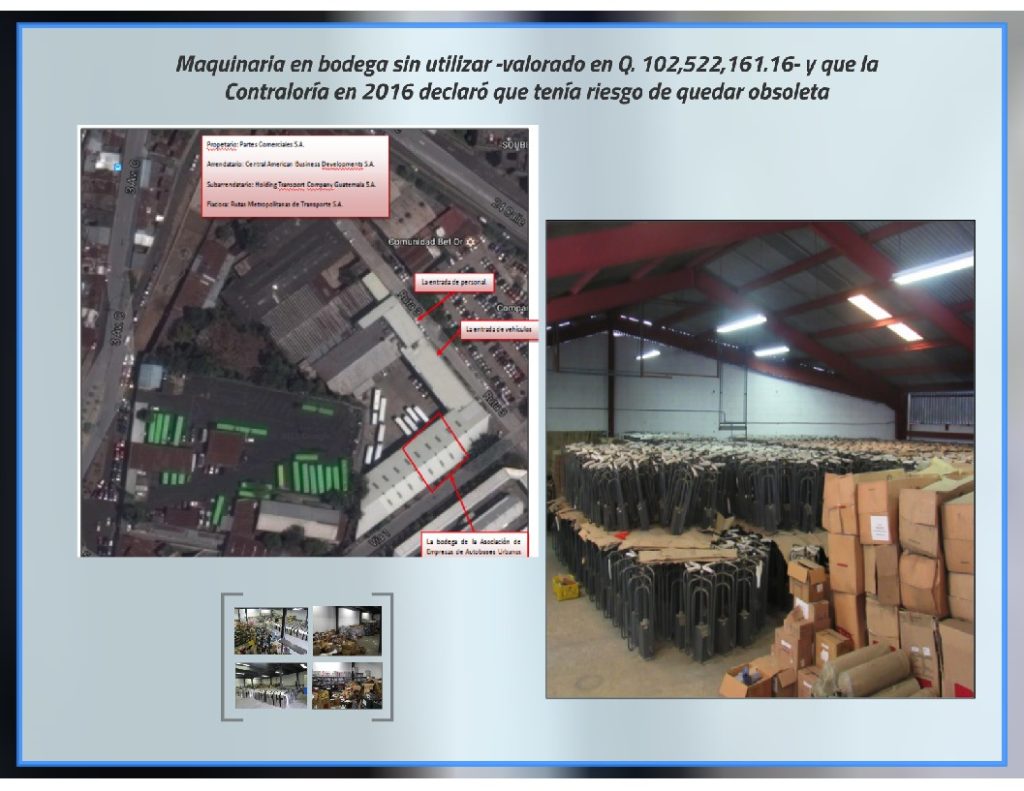 El avance de la investigación del MP y la Cicig detalló que el equipo está valorado en Q102 millones 522 mil 161.16. Un informe de 2016 de la CGC menciona que de no usarse el equipo y la maquinaria podría quedar obsoleto.