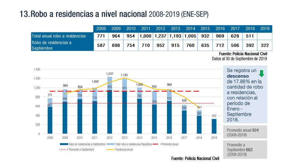 Un informe del Consejo Nacional de Seguridad detalla que del 1 de enero al 30 de septiembre último ocurrieron 322 robos en casas, pero pese a la cantidad de esos hechos se registra un descenso de casos del 17.8 por ciento en comparación con el mismo periodo de 2018. El año pasado ocurrieron 392 asaltos en viviendas más, en los primeros nueve meses.