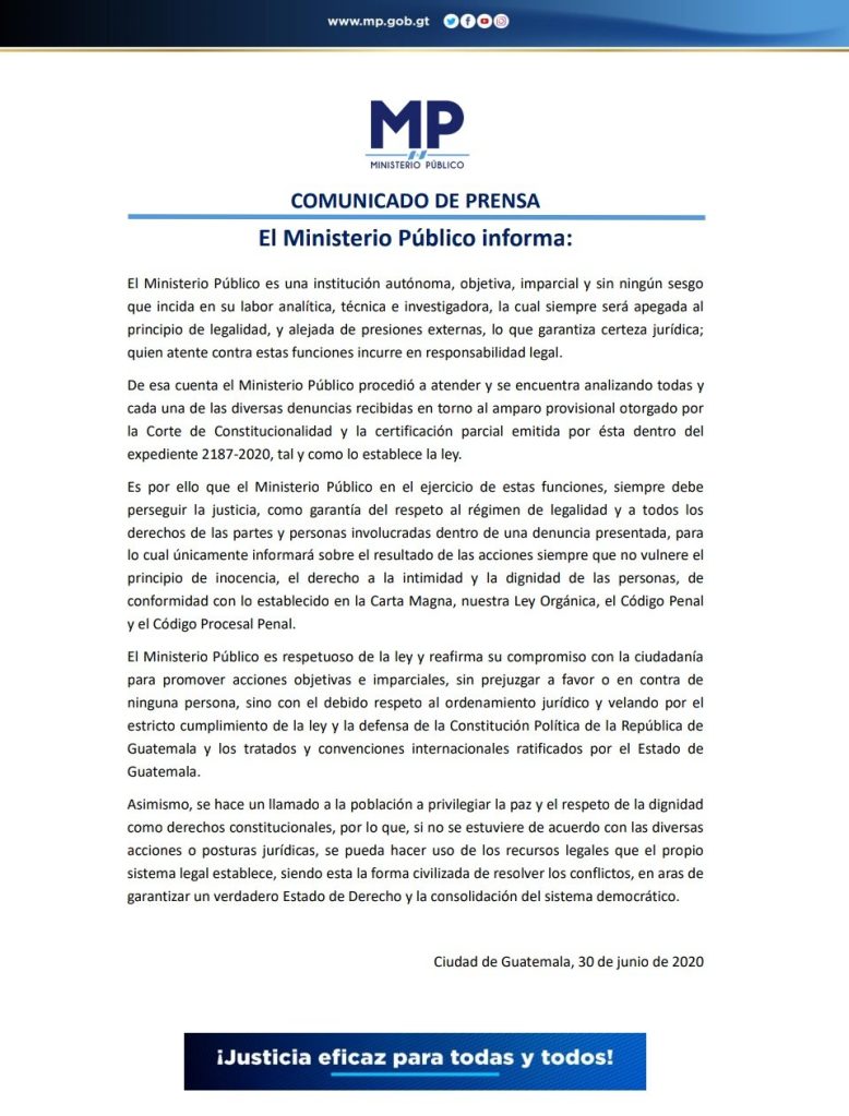 Después de tres días de silencio, el MP dirigido por la fiscal general Consuelo Porras emitió un comunicado diciendo que se encuentran “atendiendo y analizando todas y cada una de las diversas denuncias recibidas”.