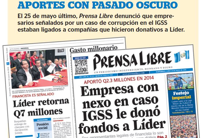 El pasado 25 de mayo, Prensa Libre dio a conocer que dos empresarios vinculados con compañías que figuran en un escándalo de corrupción en el Instituto Guatemalteco de Seguridad Social (IGSS) eran también representantes legales de otra firma que aparece entre los financistas de Líder.