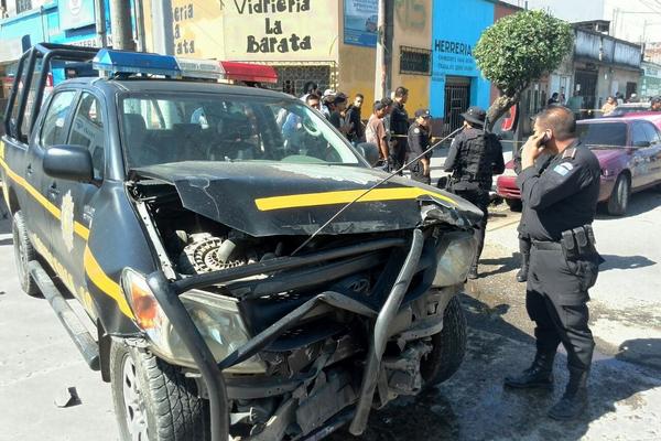 Dos agentes de la Policía Nacional Civil, del autopatrulla 16008 DPPS resultaron heridos luego que el auto donde huían los presuntos saqueadores embistió la unidad.