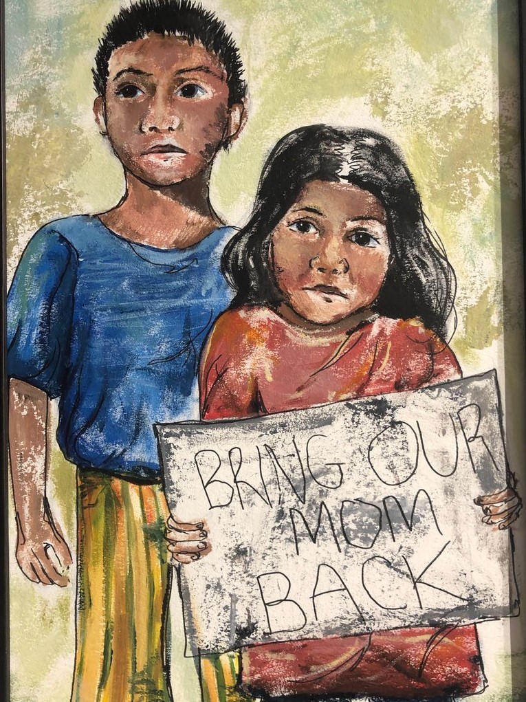 Dominick pintó a un niño y a una niña con expresiones tristes, con un cartel en las manos que dice: “Trae a nuestra madre de regreso”. El menaje hace alusión a los miles de menores migrantes que fueron separados al cruzar la frontera de Estados Unidos, como parte de la política de tolerancia cero del presidente Donald Trump.