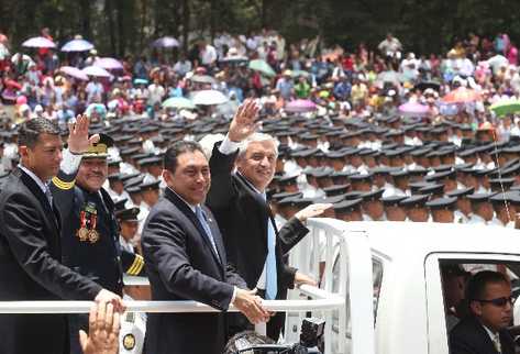 El presidente Otto Pérez, junto al ministro Mauricio López, saludan a la concurrencia desde un vehículo.