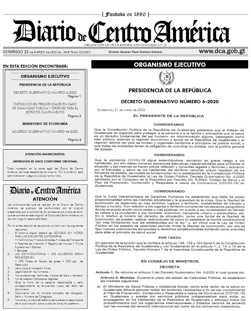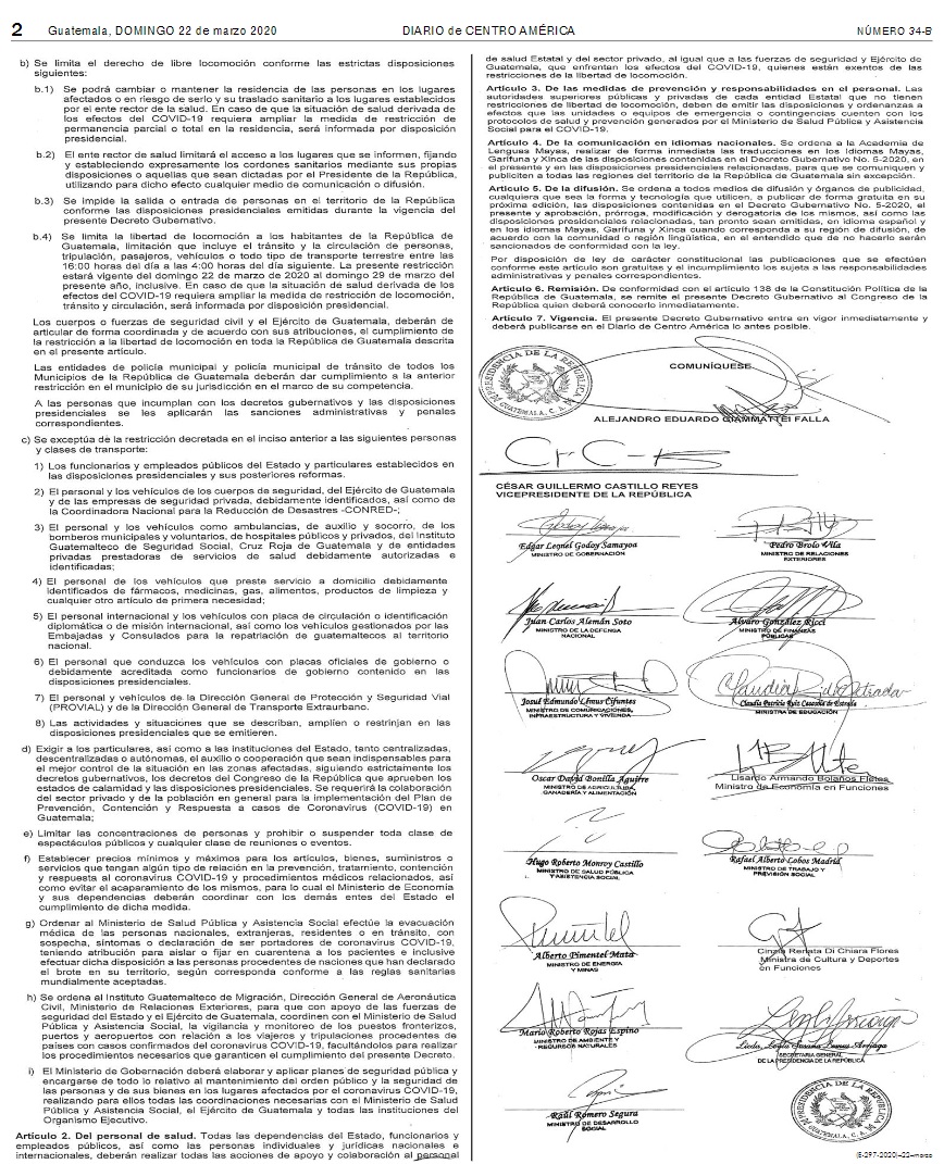 El Gobierno nombra al Ministerio de Salud Pública y Asistencia Social (MSPAS) como el ente rector en Guatemala que deberá ejecutar todas las acciones necesarias para prevenir, contener y responder a los casos de covid-19 que se reporten en el país y así minimizar su propagación.
