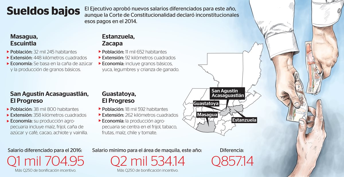 El pasado 31 de diciembre la polémica se reavivó porque en el Diario de Centro América se publicaron los acuerdos del Ministerio de Trabajo 304-2015, 305-2015, 306-2015 y 307-2015; que contienen el salario de Q55.90 por día —con base en 366 días del 2016—, a Q6.99 por hora para las jornadas laborales, más bonificación de Q250, en la industria de manufactura —maquila— en Masagua, Escuintla; Estanzuela, Zacapa; y Guastatoya y San Agustín Acasaguastlán, El Progreso.