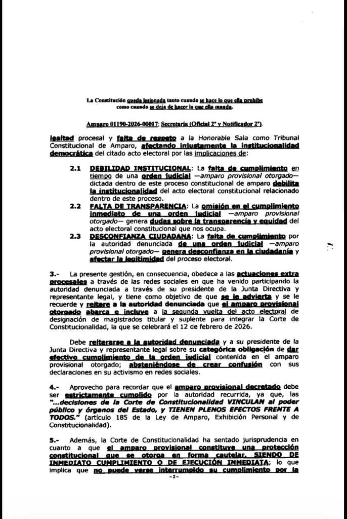 En un escrito dirigido a la Sala, Sagastume Vidaurre expone que “circulan declaraciones e información proporcionada por la autoridad denunciada, a través de su presidenta de la Junta Directiva y representante legal —Patricia Gámez—, misma que está provocando, malintencionadamente, confusión a los electores para la segunda vuelta del acto electoral programado para el 12 de febrero de 2026”.