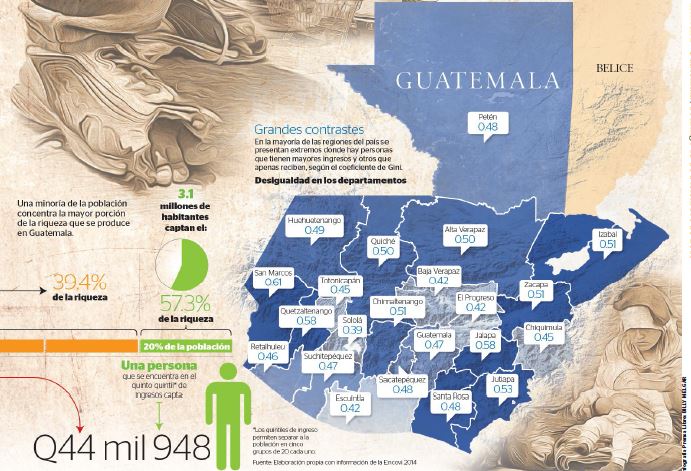 En términos monetarios lo anterior se podría explicar así: de cada quetzal que se produjo en 2014, Q0.56 fueron captados por los dueños de los medios de producción y renta de la propiedad, mientras que Q0.30 son por el factor del trabajo de las personas y Q0.11 se destinaron para el pago de impuestos para financiar el presupuesto Estatal.