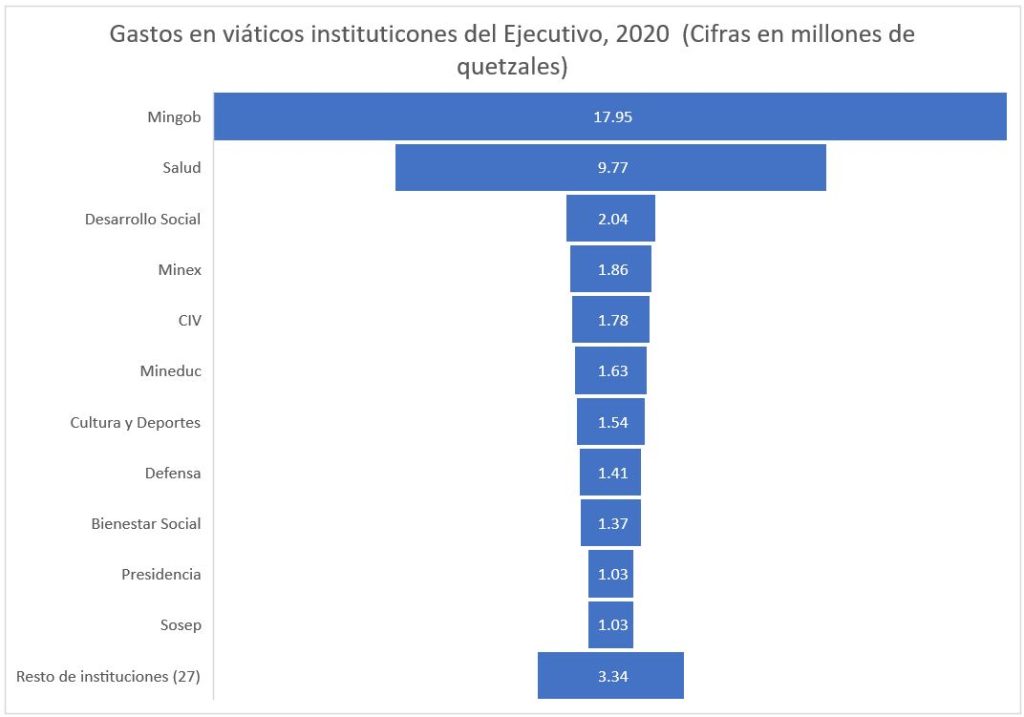 De estas dependencias, al menos una, el Mides, experimentó un aumento de gastos por viáticos respecto al 2019 por Q198 mil; además, entre esas 11 instituciones que superan el millón de quetzales en viáticos, se gastó el 93 por ciento del total de ese rubro.