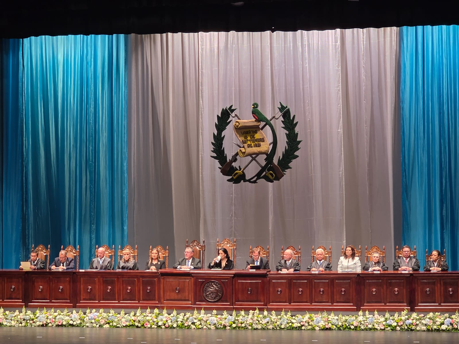Los magistrados de la octava magistratura, el presidente del Congreso; Luis Contreras, la presidenta de la Corte Suprema de Justicia; Claudia Paredes, el decano de la Facultad de Humanidades de la Universidad de San Carlos de Guatemala en representación de Walter Mazariegos y la presidenta del Colegio de Abogados y Notarios de Guatemala, Patricia Gámez, se ubican en la mesa principal del escenario.