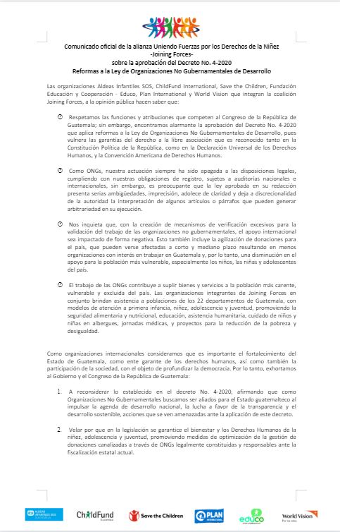 Por medio de un comunicado de prensa, la Alianza Uniendo Fuerzas por los Derechos de la Niñez, Joining Forces, señala que esta normativa vulnera las garantías del derecho a la libre asociación, además de que presenta ambigüedades y adolece de claridad, mismas que dejan a discreción de las autoridades la interpretación de algunos artículos.