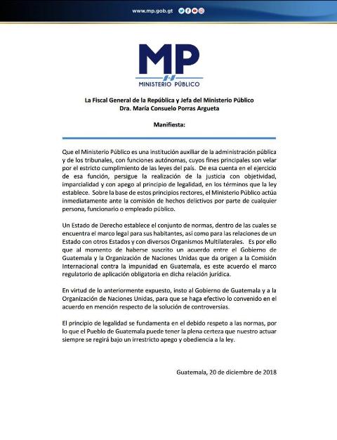 Por aparte, la fiscal general, María Consuelo Porras, instó al Gobierno de Guatemala y a la Organización de Naciones Unidas, para que se haga efectivo lo convenido en el acuerdo en mención respecto de la solución de controversias.