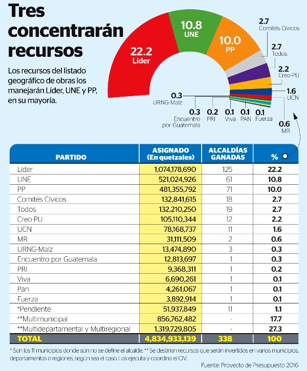 De esos recursos, Líder, con 125 alcaldías ganadas, ejecutará  Q1 mil 074.2 millones, que equivalen al  22.2 por ciento de los Q4 mil 834.9 millones que tienen destino específico, si el proyecto se aprueba como lo envió el Ejecutivo.