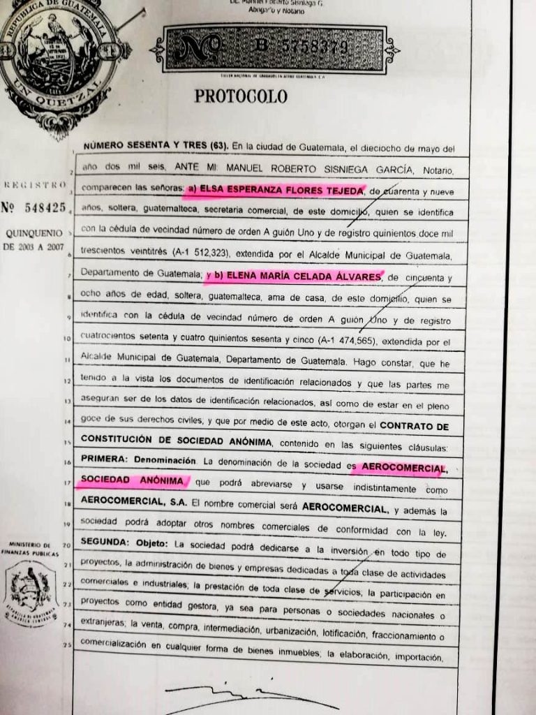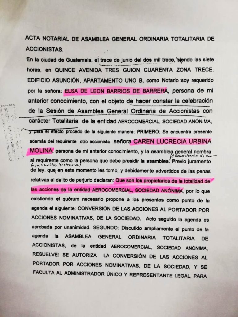 El cambio de las acciones de la empresa, de “al portador” a “nominativa”, fue registrado por el notario José Miguel Portillo Lemus, originario de Jalapa y primo del expresidente Alfonso Portillo, el 13 de junio de 2013.