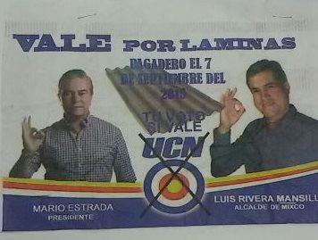 En el documento aparecen las fotografías de Mario Estrada y Rivera Mancilla. Además, se lee la frase: “Vale por láminas. Pagadero el 7 de septiembre de 2015”.