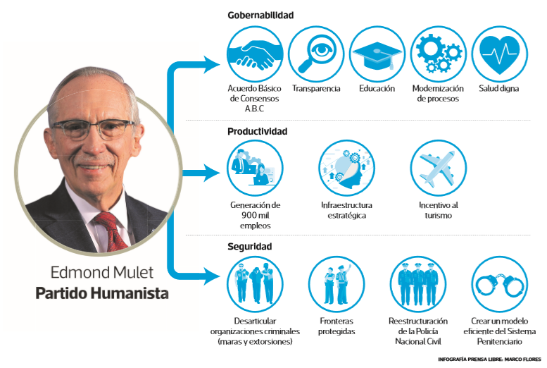 Las casas intermedias son la apuesta para lograr una efectiva reinserción juvenil. Se plantea una Academia de Oficiales de la Policía Nacional Civil (PNC) y la dignificación de los agentes a través de sus sueldos. Mulet se propone la creación de unidades de PNC en barrios y colonias y programas con iglesias evangélicas para disminuir la violencia. Para Mulet, los patrullajes conjuntos son importantes porque tienen una función de disuasión, mientras se recupera a la PNC, y solo se implementarán en áreas urbanas. Añadió que para proteger las fronteras se propone una ley de Autoridad Portuaria Nacional, en coordinación entre el Ejército y la PNC.