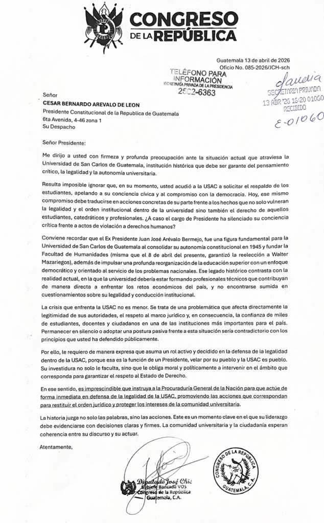 En paralelo, el diputado José Chic envió una carta al presidente Bernardo Arévalo en la que cuestiona la falta de acciones del Ejecutivo frente a la crisis en la USAC.