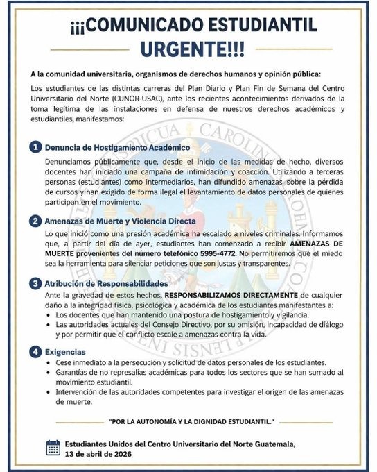 Estudiantes del Centro Universitario del Norte (Cunor-Usac) denunciaron públicamente una escalada de hostigamiento en su contra en medio de la toma de instalaciones.