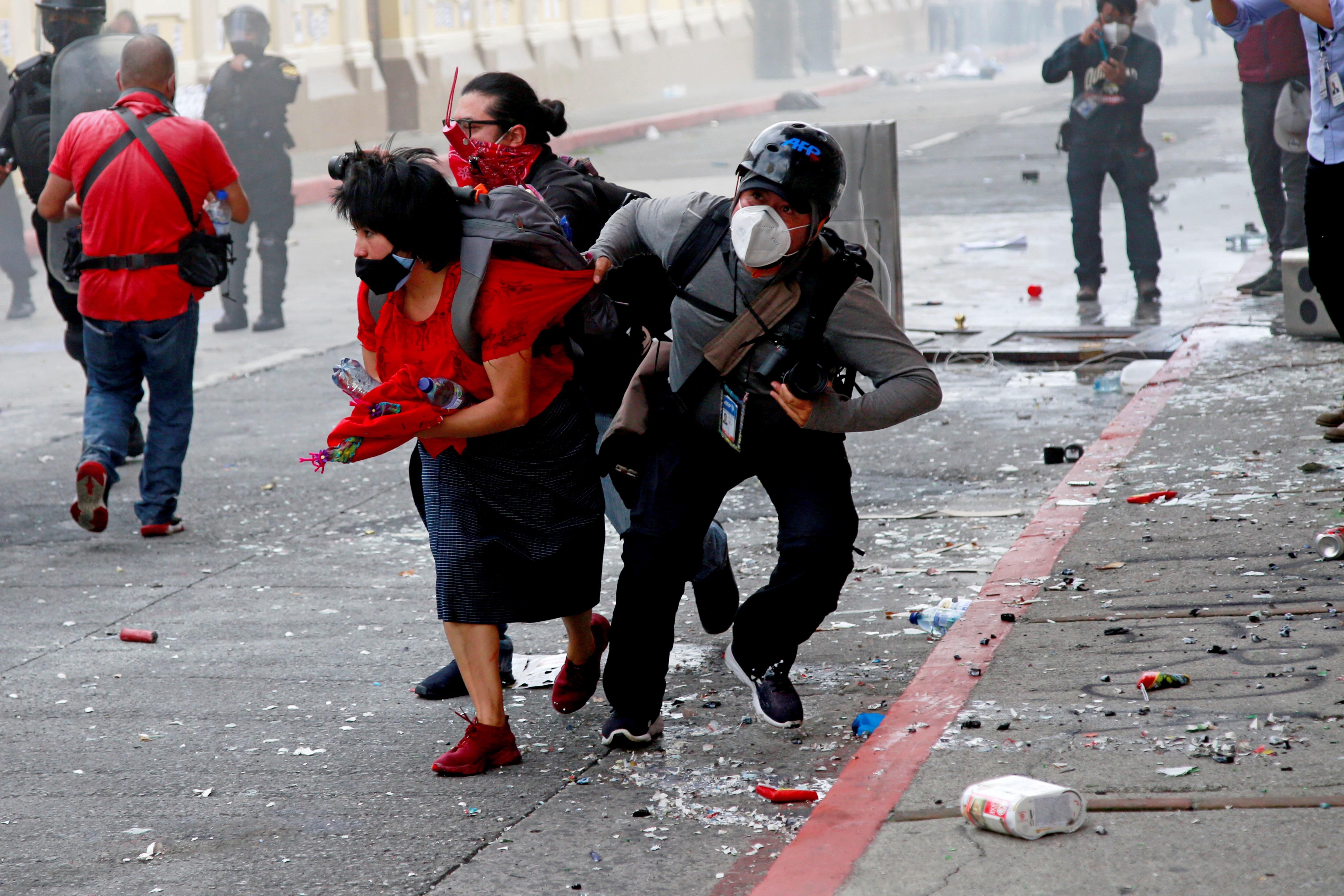 El fotógrafo Johan Ordoñez (d), ayuda a una manifestante herida durante las protestas en contra del Gobierno del presidente Alejandro Giammattei. (Foto Prensa Libre: EFE)