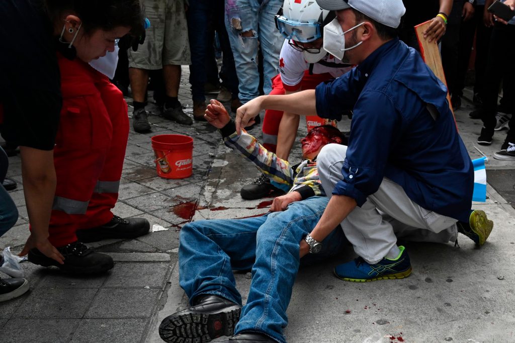 Civiles y personal de la Cruz Roja atienden a un manifestante herido luego de que la Policía lanzara bombas con gases lacrimógenos para disolver a un grupo que se enfrentó con las fuerzas policiales. ( Foto Prensa Libre: AFP)