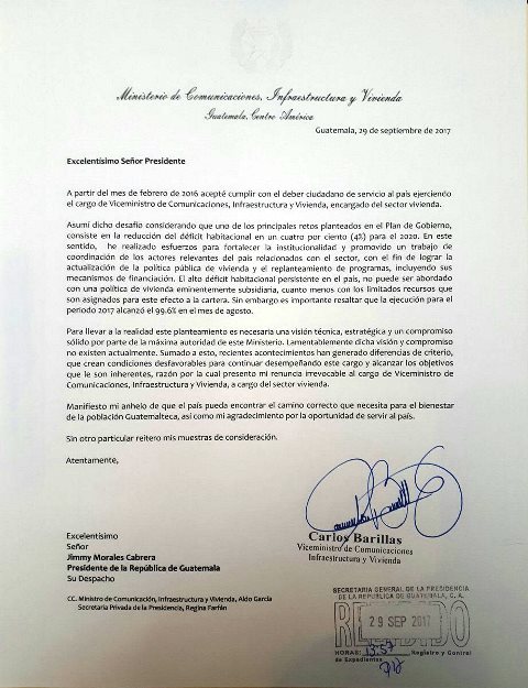 En otra parte de la carta Barillas escribió: “Manifiesto mi anhelo de que el país pueda encontrar el camino correcto que necesita para el bienestar de la población guatemalteca”.