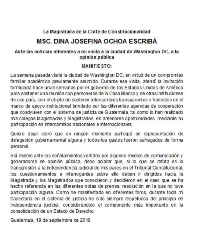 La declaración agrega: “En consecuencia, cualquier información emitida por cualquier magistrado o funcionario a título personal no es atribuible al pleno de la Corte de Constitucionalidad, que ejerce las funciones que le otorga la Constitución con total independencia”.