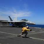 Como parte de la operación Mares del Sur 2026 dirigida por Estados Unidos, un F18 aterriza en la pista del USS Nimitz. (Foto Prensa Libre: Antonio Jiménez)