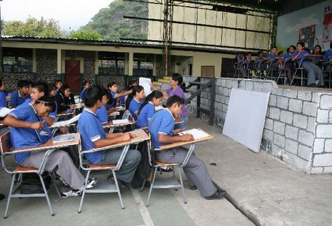 Gladys Urízar, directora de básicos, refirió que, por la falta de espacio, estudiantes de tres secciones reciben clases en los corredores y el patio del plantel, exponiéndose a la lluvia, el frío y el polvo.