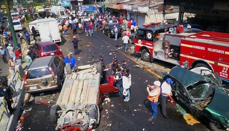 El tráiler, que se dirigía a la zona 1 de Mixco, iba cargado con material para la fabricación de productos de limpieza. Impactó a por lo menos 25 vehículos.