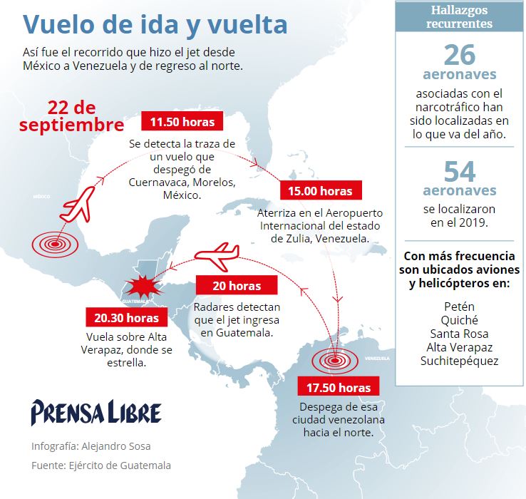 Autoridades Guatemaltecas informaron que esa nave había volado desde México a Venezuela y luego en su viaje de retorno se estrelló en una comunidad de Alta Verapaz, cuando intentaba aterrizar en una pista ilegal.