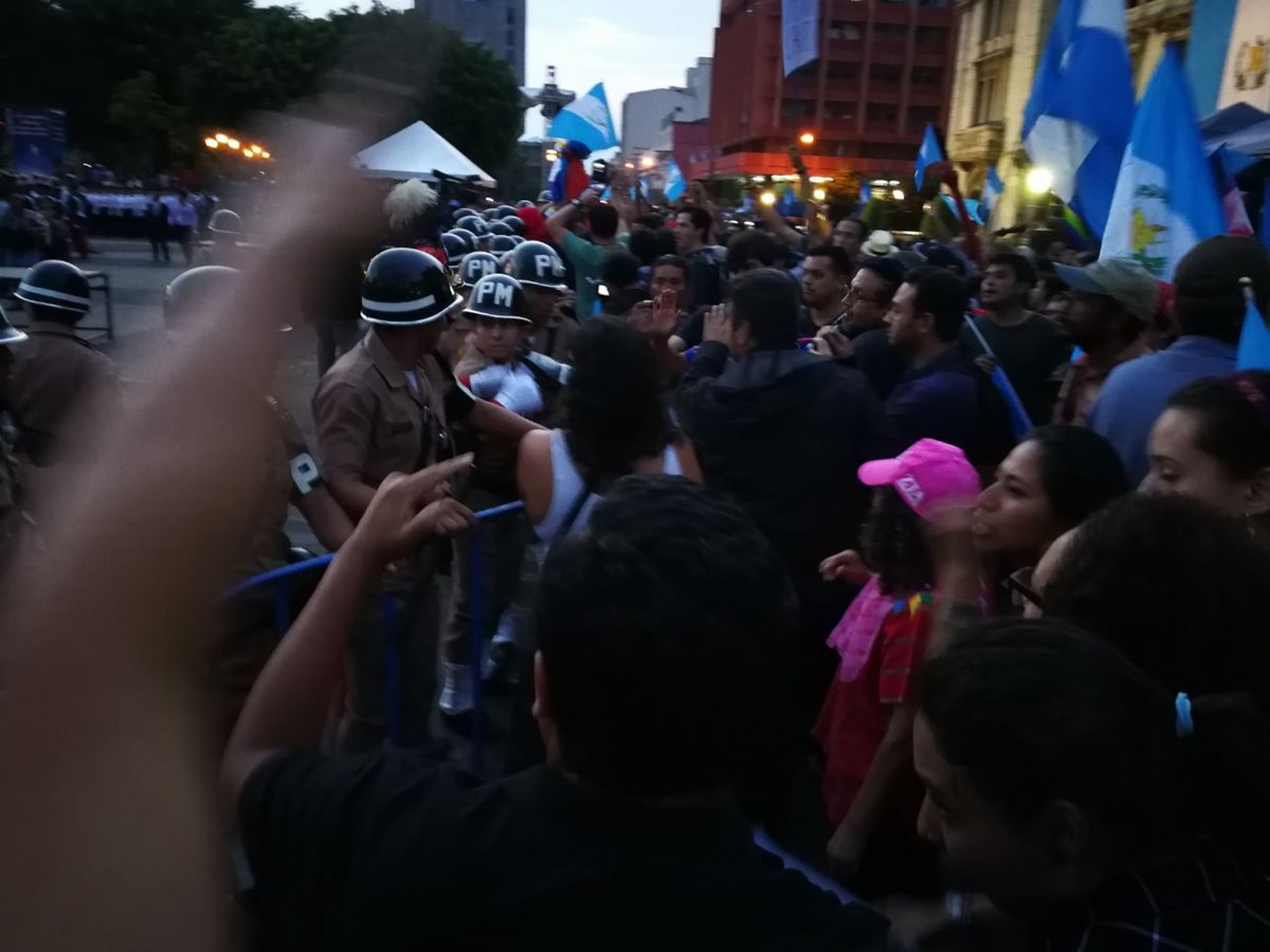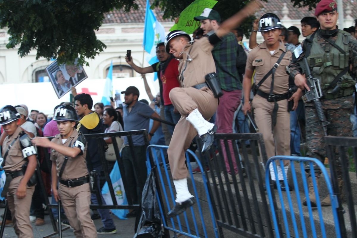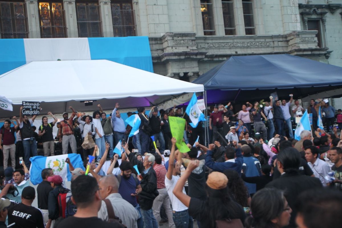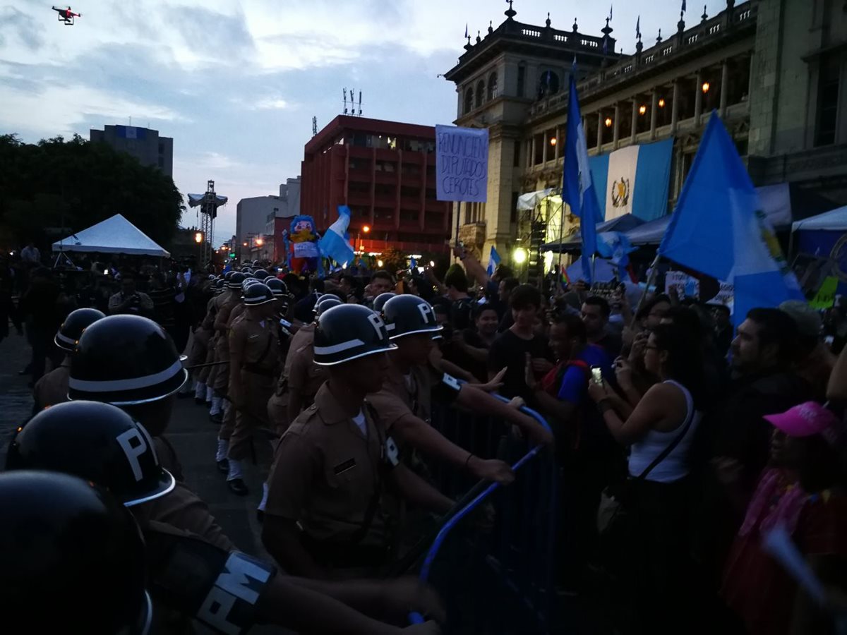 Tras el retiro de los cadetes, los policías militares se retiraron y fue ahí donde los manifestantes ocuparon el espacio de la plaza central para repudiar la conducta de Jimmy Morales, quien recibía Q50 mil mensuales del Ejército por concepto de “bono extraordinario de responsabilidad”, y que según información oficial ya devolvió, y de los diputados, quienes el miércoles aprobaron cambios legales a favor de la corrupción e impunidad. También izaron una pequeña bandera de Guatemala, mientras gritaban las consignas contra los políticos corruptos.
