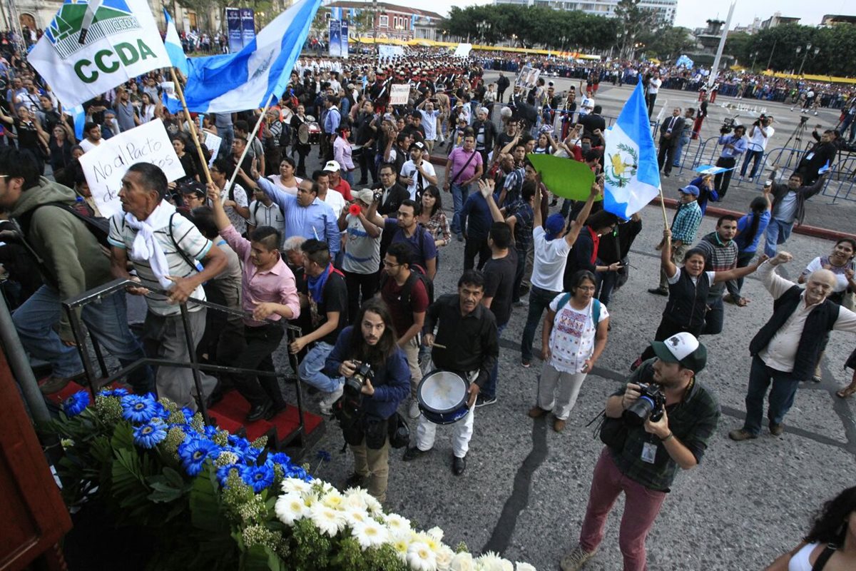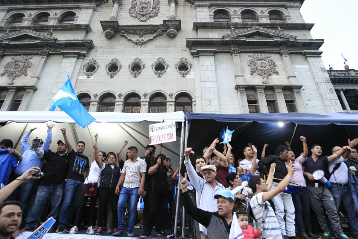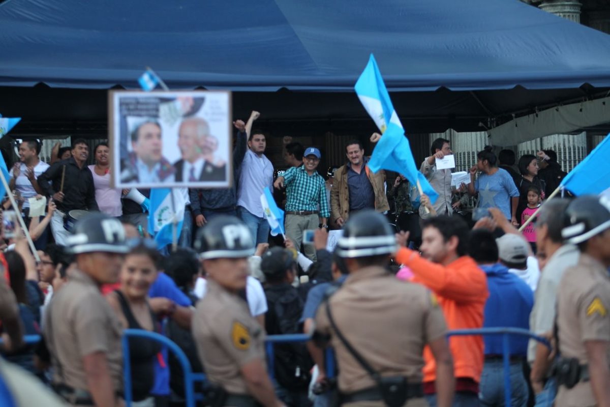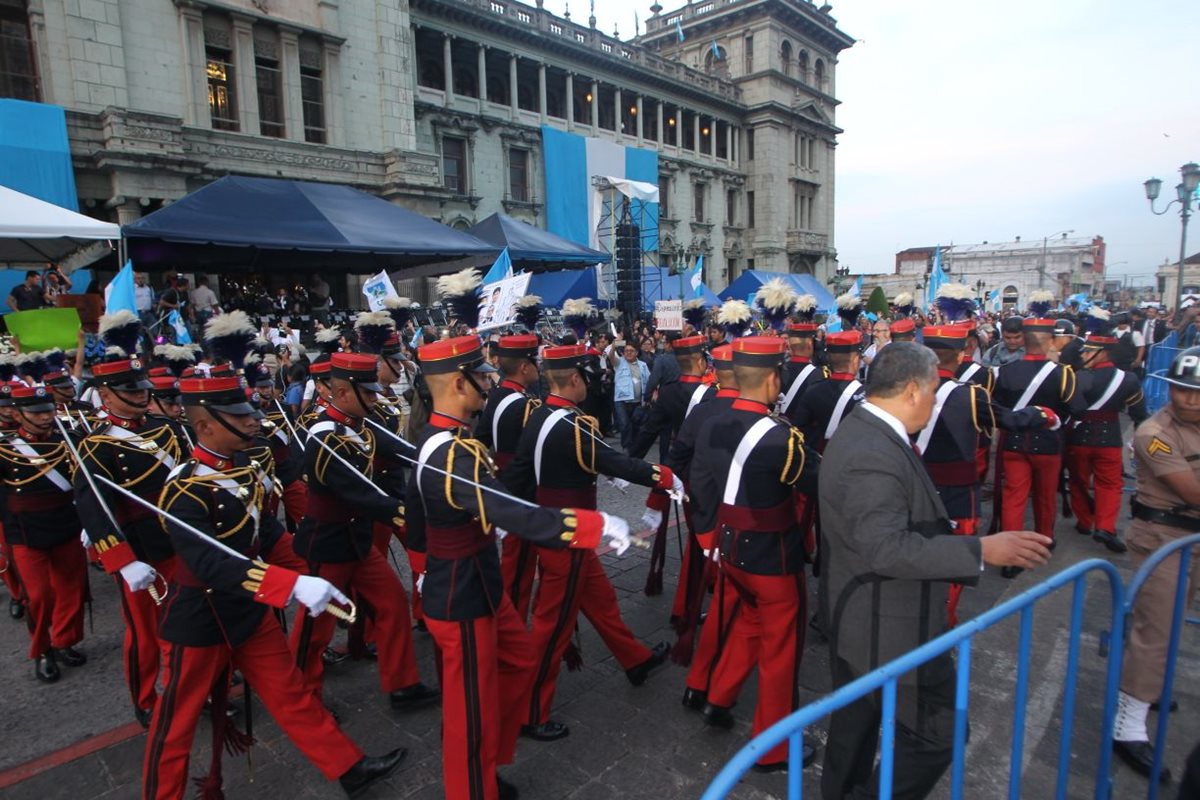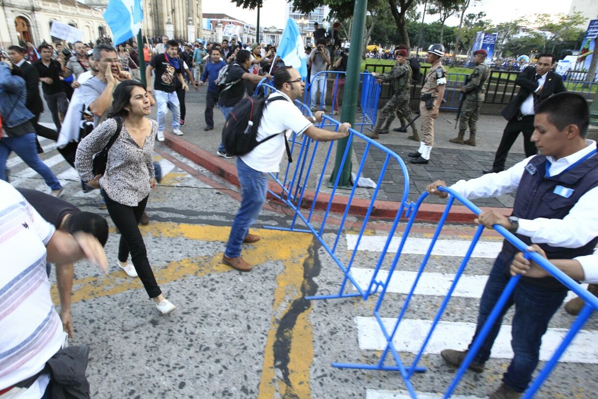 Tras el retiro de los cadetes, los policías militares se retiraron y fue ahí donde los manifestantes ocuparon el espacio de la plaza central para repudiar la conducta de Jimmy Morales, quien recibía Q50 mil mensuales del Ejército por concepto de “bono extraordinario de responsabilidad”, y que según información oficial ya devolvió, y de los diputados, quienes el miércoles aprobaron cambios legales a favor de la corrupción e impunidad. También izaron una pequeña bandera de Guatemala, mientras gritaban las consignas contra los políticos corruptos.