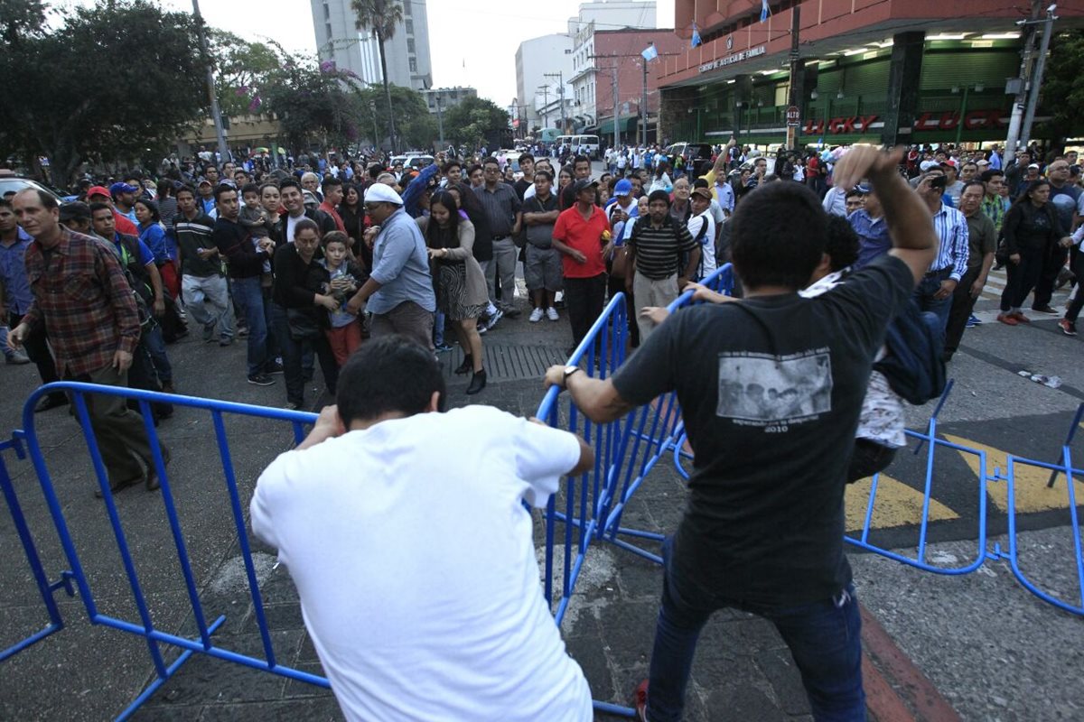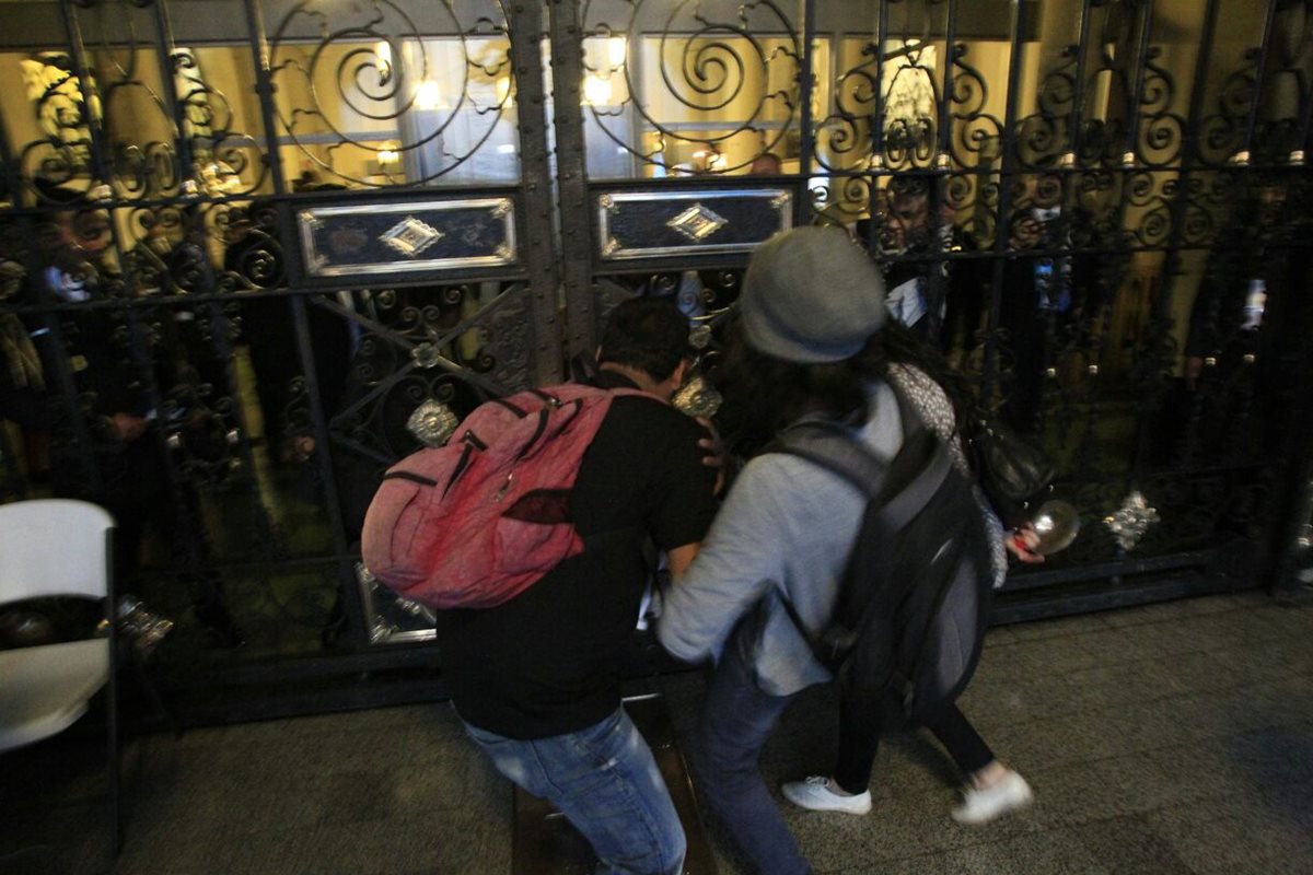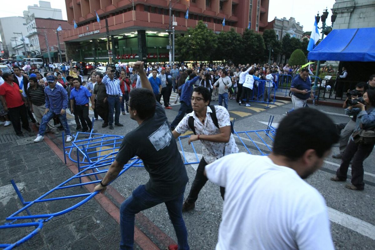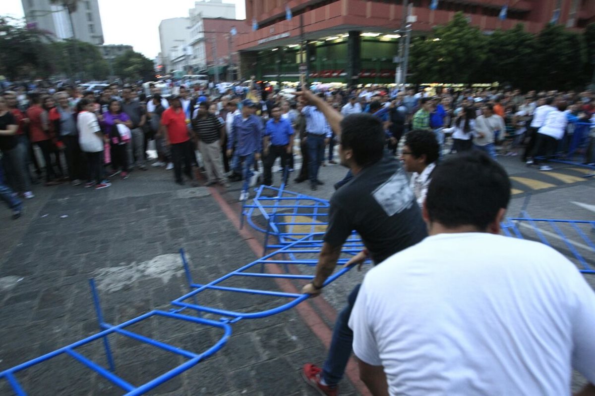 Los manifestantes intentaron pasar a la Plaza, pero al no poder hacerlo, empujaron unas vallas que tapaban el paso hacia una tarima instalada frente a la puerta principal del Palacio Nacional de la Cultura y donde usualmente las autoridades de Gobierno observan el desfile escolar con el que se festeja la independencia del 15 de septiembre.
