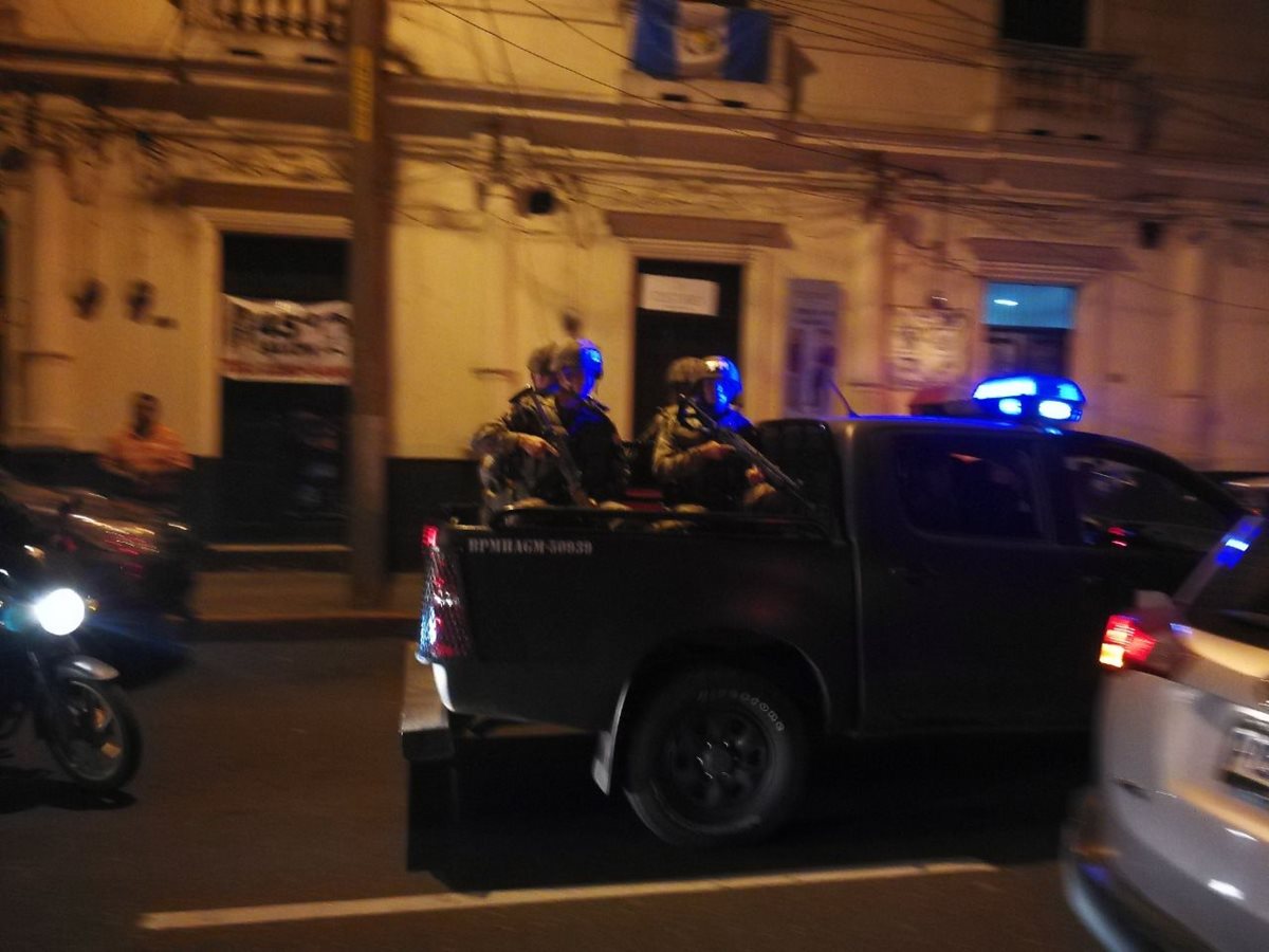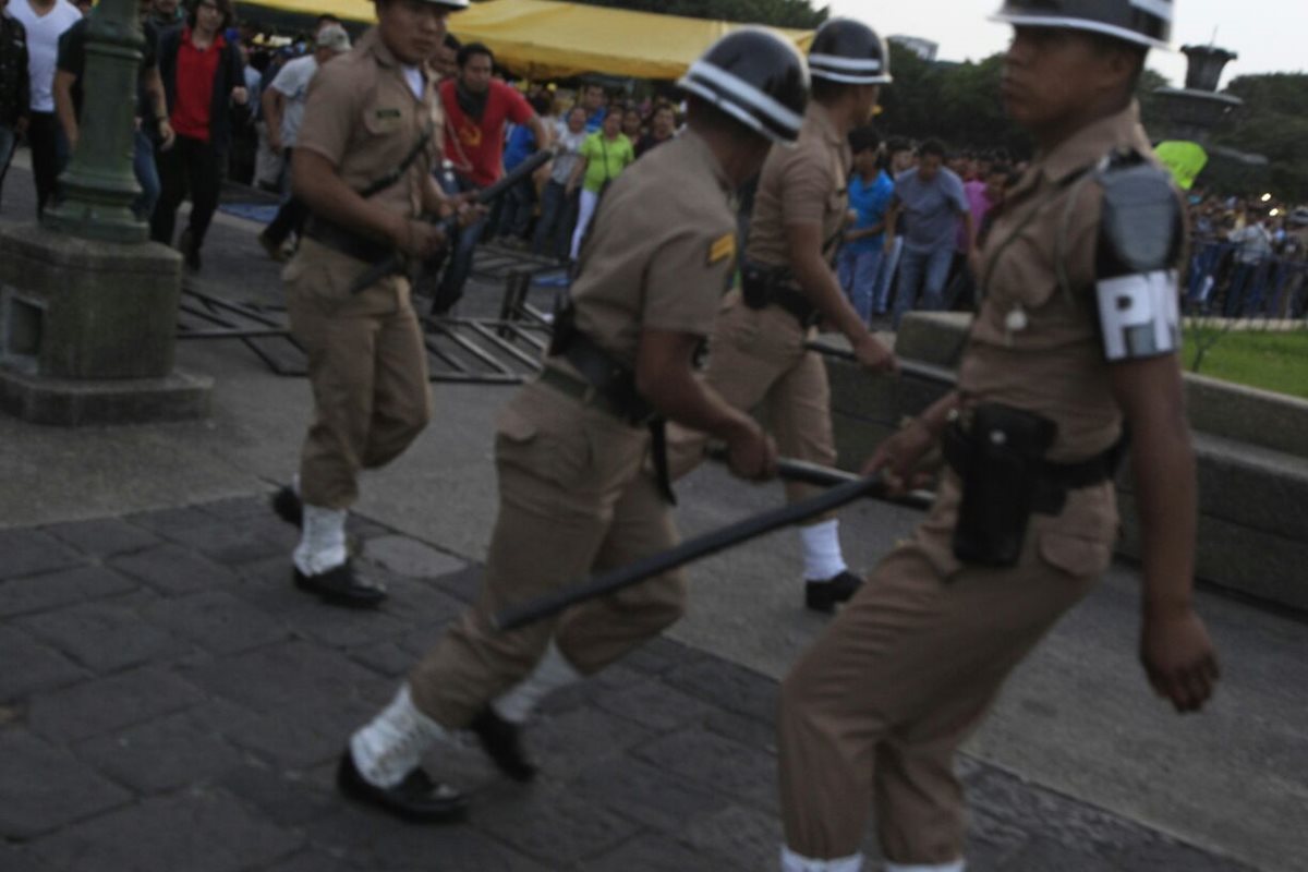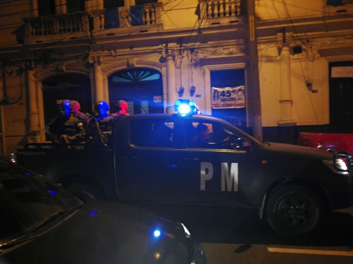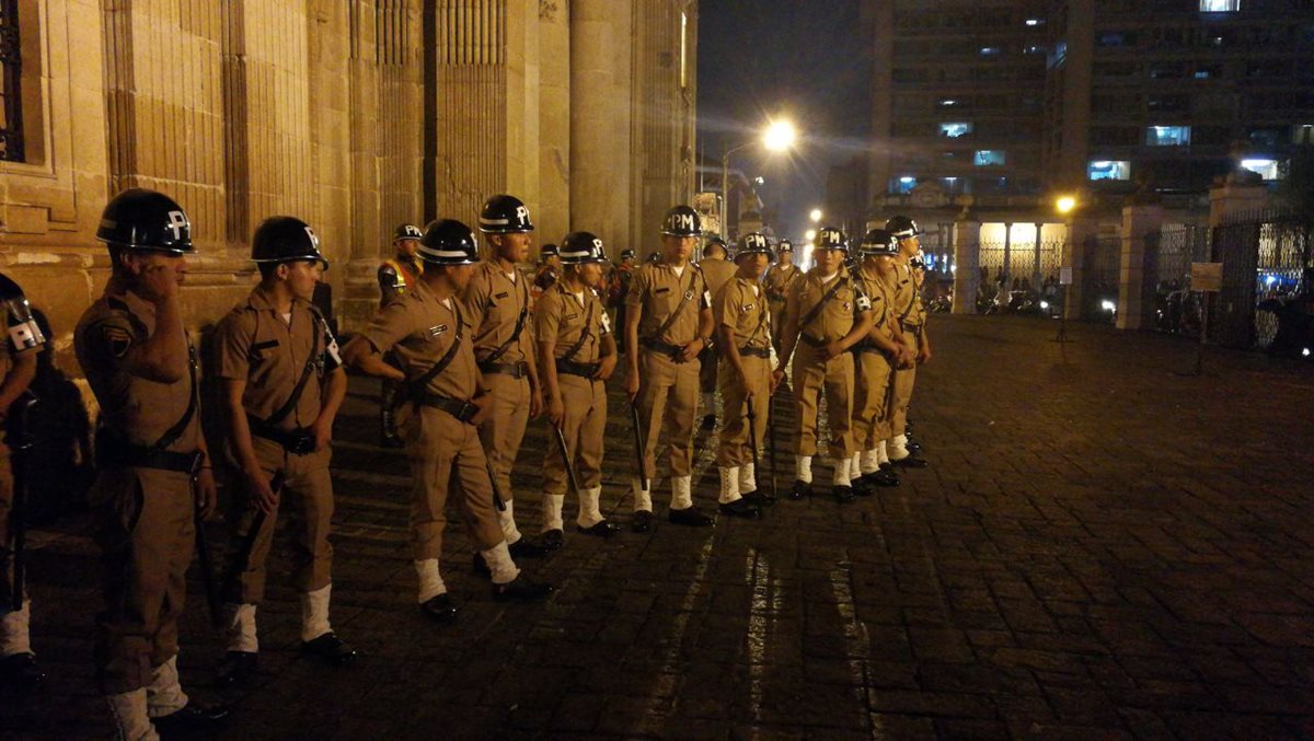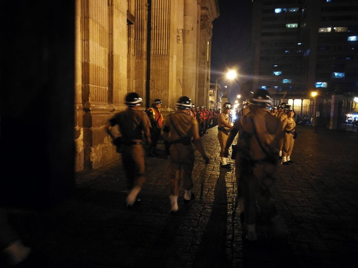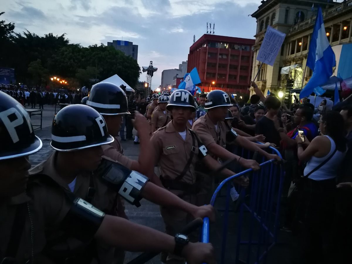Minutos después de que los manifestantes llegaran a la plaza, fueron desplegadas fuerzas antidisturbios de la Policía Nacional Civil quienes se ubicaron en grupos en los alrededores del Palacio Nacional.