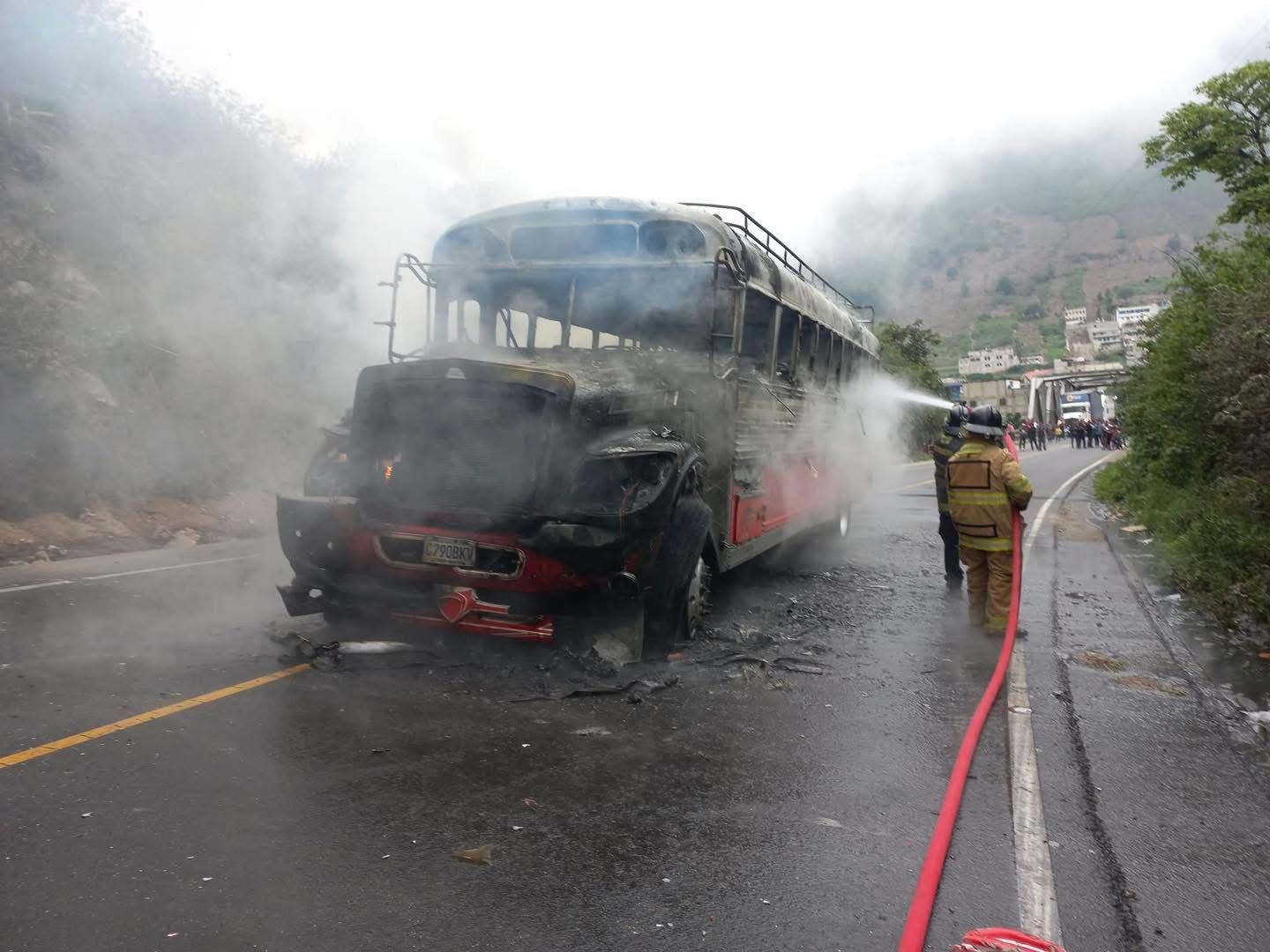 Bomberos Voluntarios trabajaron para apagar un bus incendiado en Cantel, el cual fue quemado por pobladores que señalaron que el vehículo manejaba de forma imprudente. (Foto Prensa Libre: Bomberos Voluntarios)