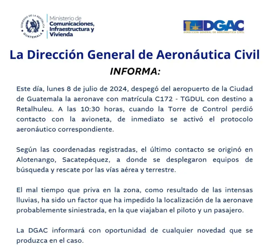 Además, detalló que el último contacto que se tuvo de la aeronave fue en Alotenango, Sacatepéquez.
