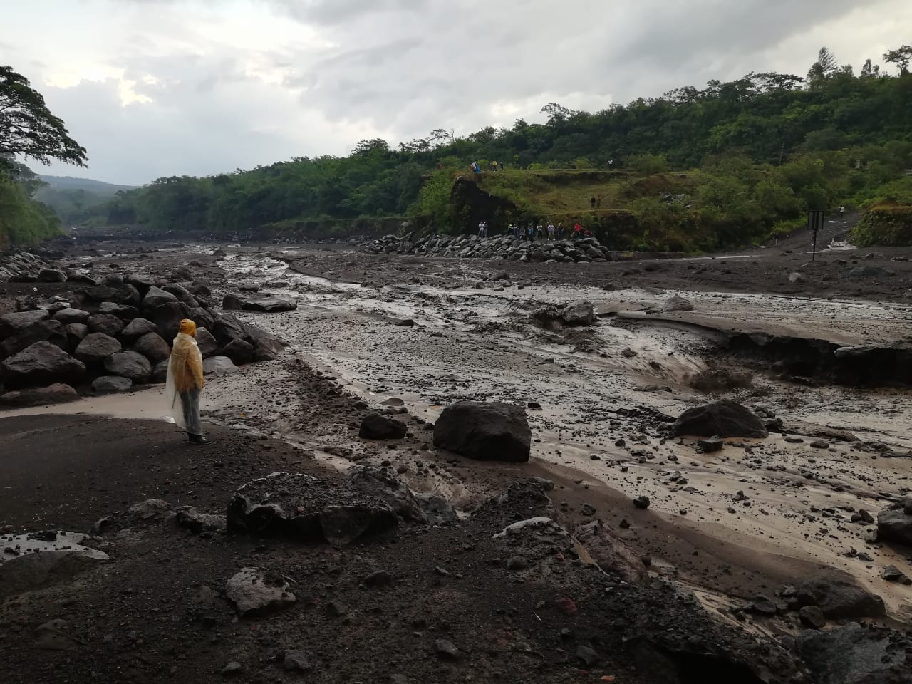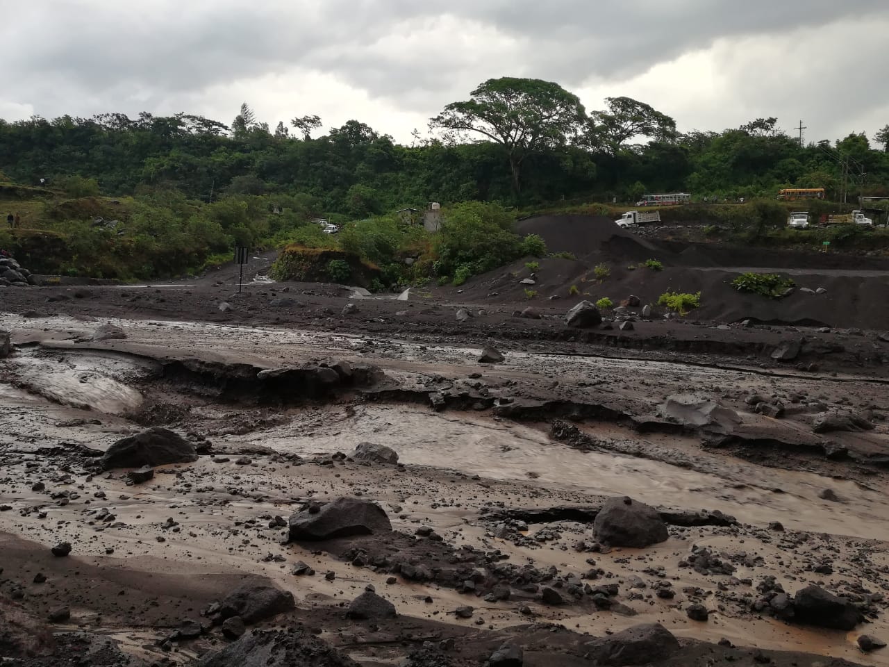 Imágenes muestran a varios vehículos que ya no pudieron pasar por el río debido al material volcánico, mientras pobladores esperan a la orilla del afluente para poder llegar a sus comunidades.