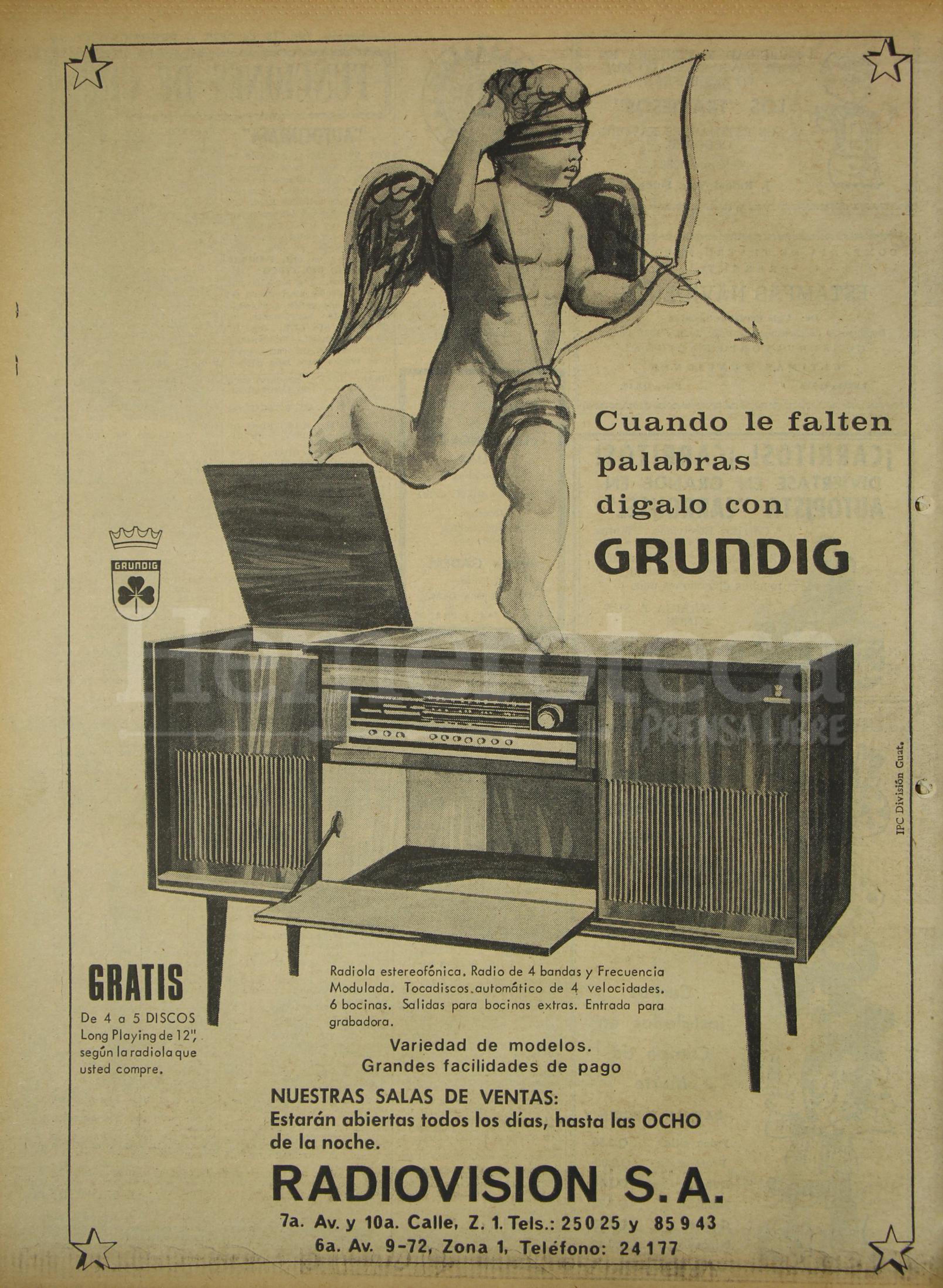 Fue el 22 de agosto de 1951, el tercer ejemplar sacado en Prensa Libre en su historia, se puede observar la primera publicidad de un tocadiscos. Se trataba del modelo XP-335, con capacidad de reproducir discos de vinilo de diferentes tamaños (18, 20 y 25 centímetros), así como diversas velocidades (33 y media, 45 y 78 revoluciones).