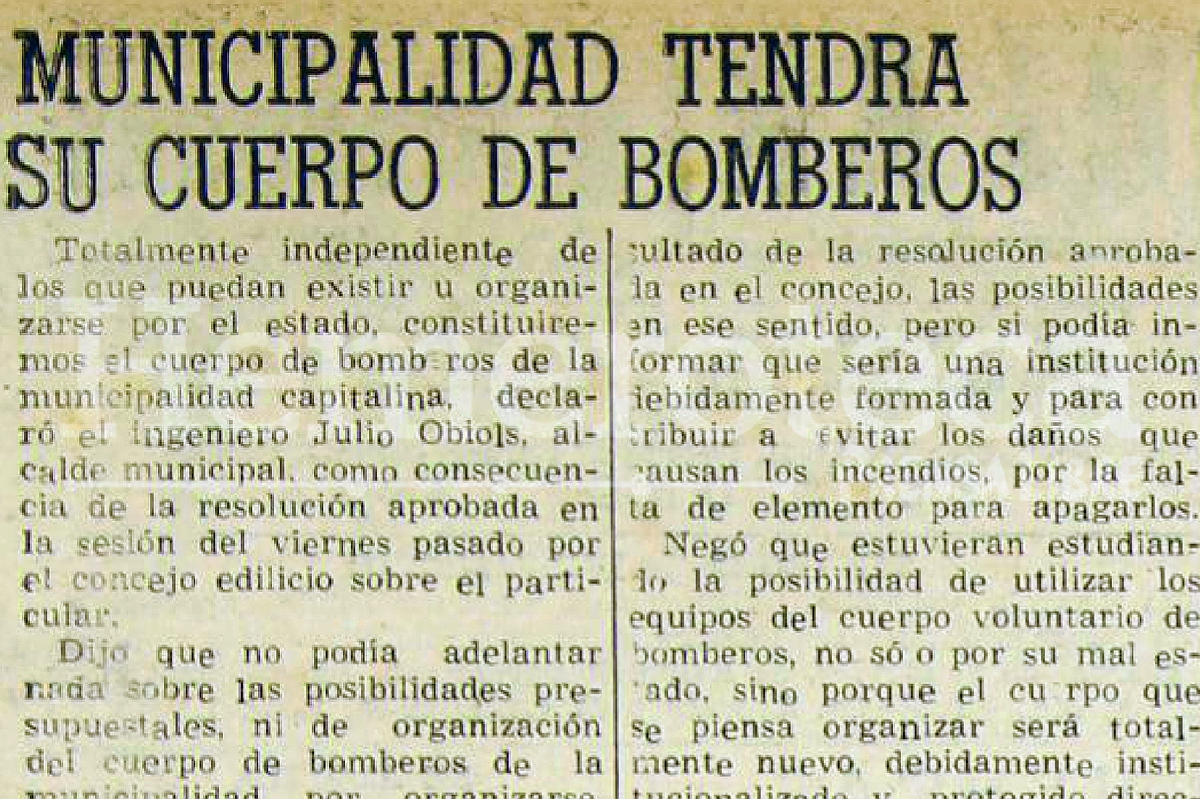 El ingeniero Obiols dijo que no podía adelantar nada sobre las posibilidades presupuestales, ni de organización del cuerpo de bomberos de la municipalidad por organizarse, pues estaba estudiando, como resultado de la resolución aprobada en el concejo, las posibilidades en ese sentido, pero sí podía informar que sería una institución debidamente formada y para contribuir a evitar los daños que causan los incendios, por la falta de elemento para apagarlos.
