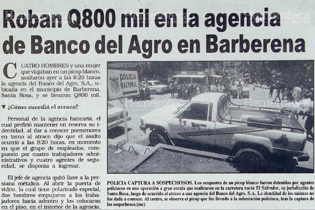 Fue noticia el 10 de mayo de 1995 el asalto a una agencia bancaria ubicada en Barberena, Santa Rosa.