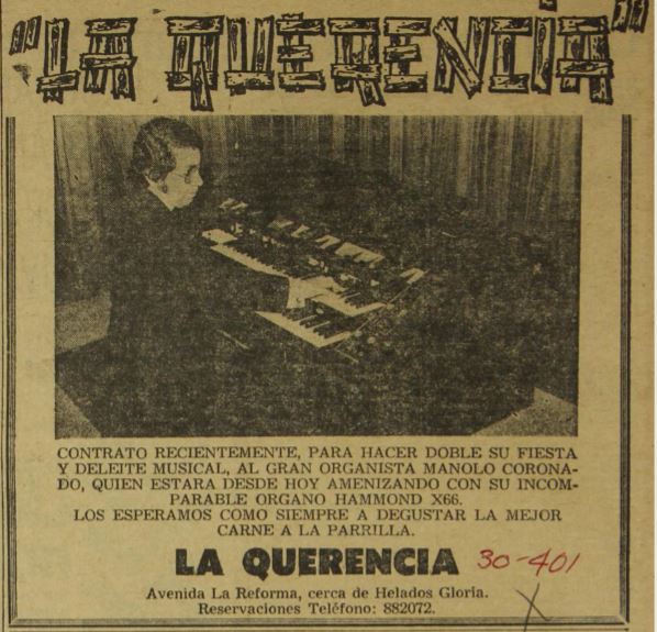 El organista Manolo Coronado ofrecía sus servicios para amenizar cualquier tipo de fiesta. Si deseaba contratarlo, podría contactarlo o deleitarse con su música en el restaurante “La Querencia” ubicado en Avenida La Reforma.