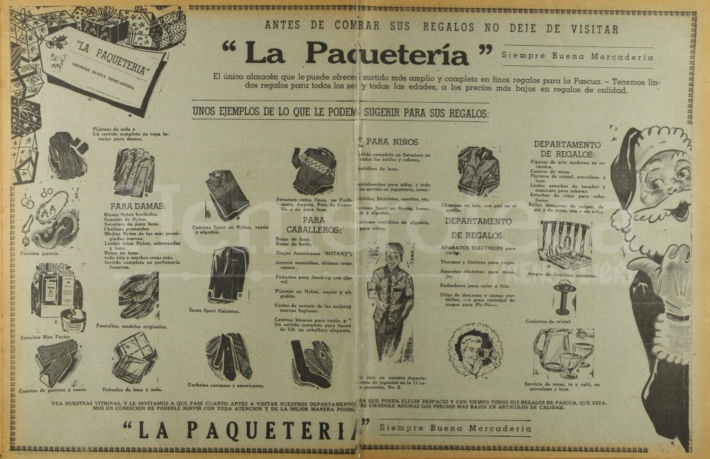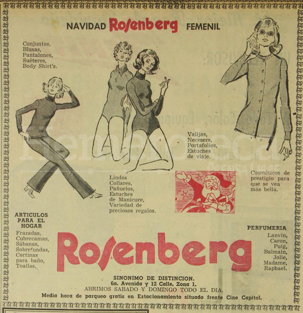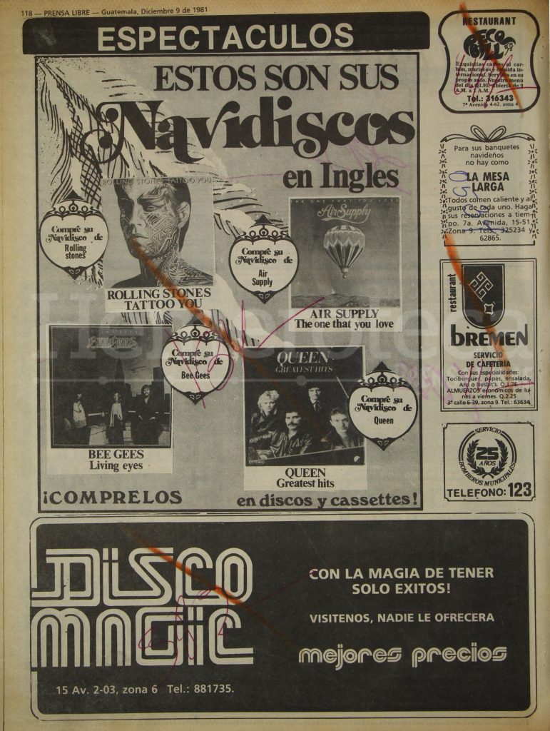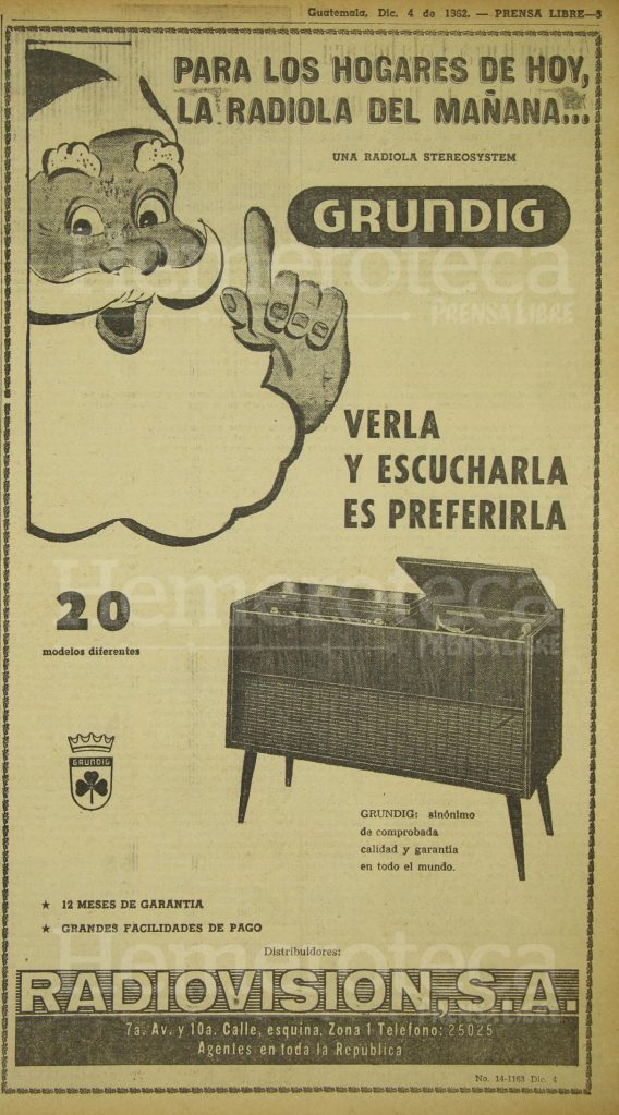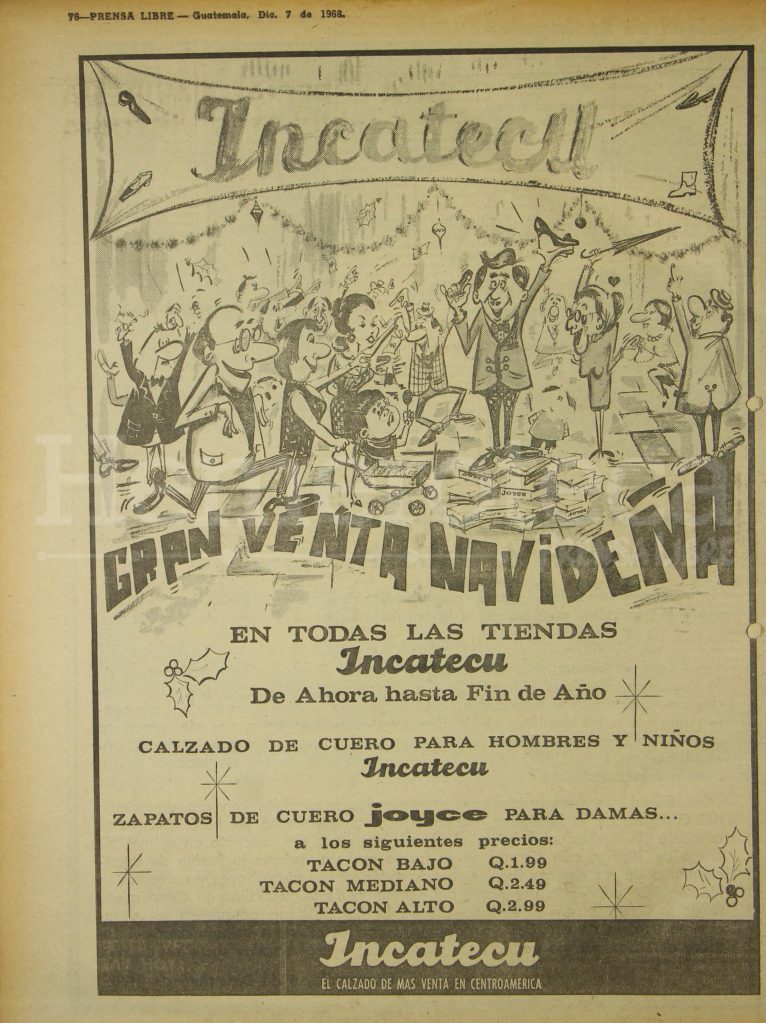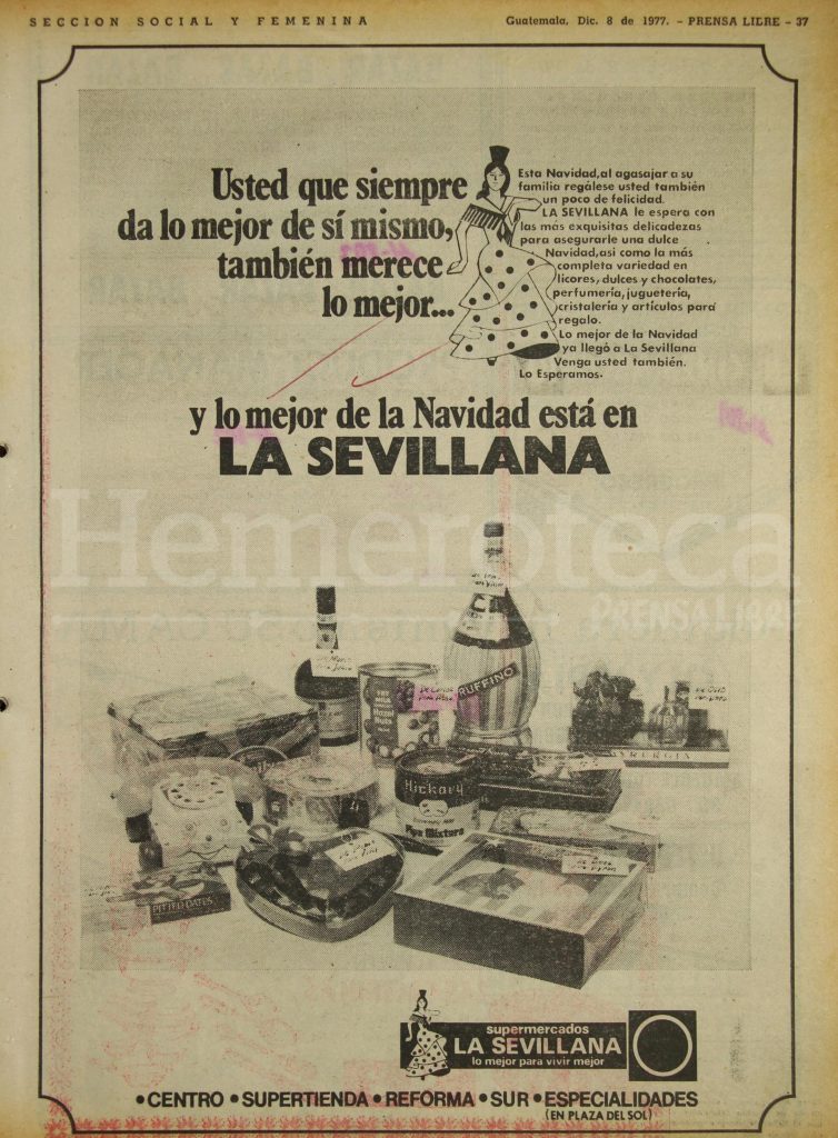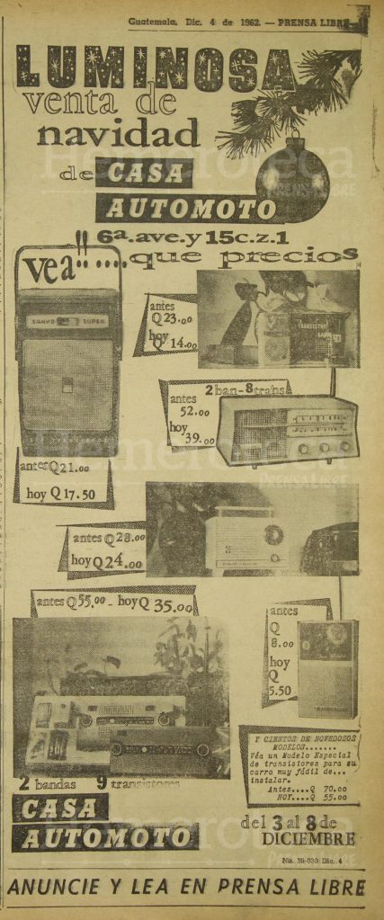 El desaparecido almacén La Paquetería que se encontraba en la 6a. avenida ofrecía una variedad de artículos y regalos para la temporada. Anuncio del 6 de diciembre de 1953. (Foto: Hemeroteca PL)Los avances tecnológicos eran ofrecidos en la temporada navideña. Este anuncio publicado el 4 de diciembre de 1962 promocionaba una radiola la cual tenía radio y tocadisco. (Foto: Hemeroteca PL)Vea estos precios: Q17.50 un radio portátil. Un radio para carro costaba Q35.00 según este nuncio de Casa Automoto publicado el 4 de diciembre de 1962. (Foto: Hemeroteca PL)La popular marca de zapatos Incatecu promocionaba una gran venta navideña en 1968. (Foto: Hemeroteca PL)Juguetes mecánicos, peluches y muñecas para los pequeños y pequeñas de casa ofrecía el antiguo almacén Schacher Hnos en 1965. (Foto: Hemeroteca PL)El último grito de la moda en ropa, cosméticos y accesorios para dama promocionaba el almacén Rosenberg en 1972. (Foto: Hemeroteca PL)El desaparecido supermercado La Sevillana ponía a disposición de sus clientes los mejores productos para la cena navideña, regalos y juguetes en 1977. (Foto: Hemeroteca PL)Disco Magic y sus “Navidiscos” con los artistas más populares del momento, como Air Supply, Bee Gees y Queen en 1981. (Foto: Hemeroteca PL)Modernos equipos de sonido marca “Technics” ofrecía almacenes Kismet, una cadena que funcionó durante varias décadas en el país. (Foto: Hemeroteca PL)