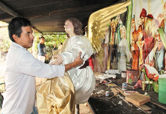 Materiales como la fibra de vidrio, duroport, aserrín, yeso, cartón y pintura acrílica saturan, por momentos, el taller Decoraciones Nuestra Señora de Fátima, propiedad de José Adolfo Pérez Gálvez (calle a San Felipe No. 26, Jocotenango).